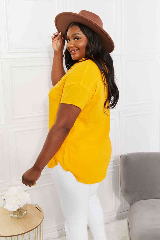 Zenana Full Size Summer Breeze Gauze Short Sleeve Shirt in Mustard